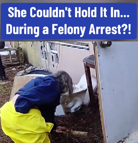 As officers move in to place her under arrest, the woman begins squirming and telling police she “really needs to go.” Moments later, chaos ensues as she abruptly bends over near a broken-down toilet outside the house — shocking both the officers and viewers watching the viral footage online.