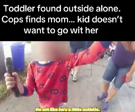 After about 20 minutes of searching nearby homes, officers located a woman who claimed to be the boy’s mother. However, when they brought her to the scene, the situation took an unexpected turn — the toddler refused to go with her. In the footage, he clings to the officer’s hand and begins to cry as his mother approaches, saying, “No! No!”