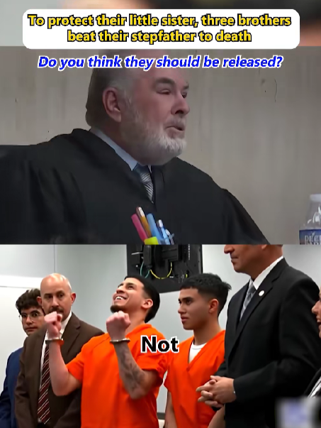 A shocking and emotionally charged case has ignited fierce public debate after three brothers were convicted of fatally beating their stepfather, whom they accused of sexually abusing their younger sister. The courtroom scenes — showing the young men in orange prison uniforms, emotional and defiant — have since gone viral, with millions questioning whether justice was truly served or if the brothers were acting out of desperate protection.