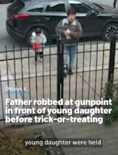 A terrifying moment was caught on camera in Chicago when a father was robbed at gunpoint right in front of his young daughter, just minutes before the two were about to go trick-or-treating. The chilling footage has left the community outraged — and grateful that, despite the trauma, both father and child escaped unharmed.
