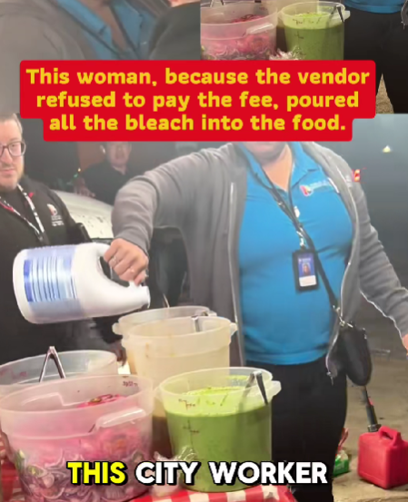 In the footage, the city worker can be seen holding a large container labeled as cleaning bleach. Moments later, she begins pouring the liquid into the vendor’s food containers while other staff look on. People nearby can be heard reacting with surprise, confusion, and frustration. The vendor, visibly upset, attempts to protest the destruction of the food, which had been prepared and stored for customers.