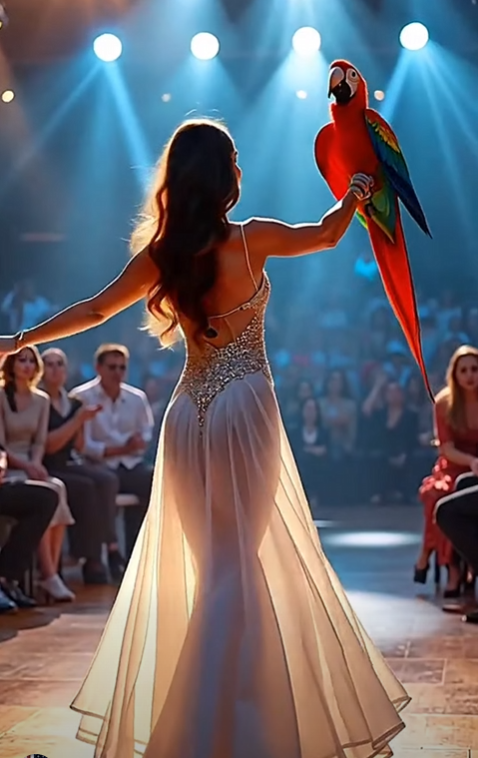 The parrot returns to her shoulder. The wings fold back into a simple dress once more. Silence hangs in the air—then the audience erupts into applause.