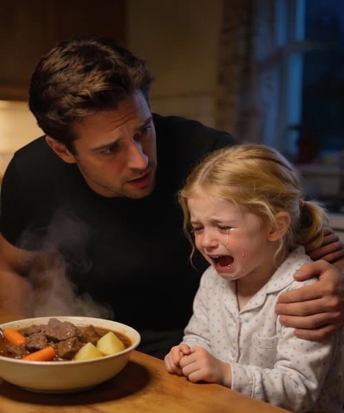 By evening, I decided to make dinner—something warm and filling, something comforting. Beef stew felt right. I chopped carrots and potatoes, browned the meat, let everything simmer until the whole house smelled rich and savory. Lily sat at the table, swinging her legs slightly, hands folded neatly in her lap. I set a small bowl of stew in front of her, along with a spoon and a napkin, and sat across from her with my own bowl. She didn’t move. At first I thought she was waiting for me to start, but even after I took a bite, she remained frozen, eyes locked on the stew as if it might vanish or do something unexpected. Minutes passed. The steam rose and faded. Finally, I asked gently why she wasn’t eating. She didn’t answer right away. Her shoulders hunched inward, and she stared down at the table. When she spoke, her voice was barely above a whisper. “Can I eat today?” The question didn’t make sense, and for a moment my brain refused to accept what I’d heard. I smiled automatically, trying to keep things light, and told her of course she could eat. That’s when everything changed. Her face crumpled instantly, and she burst into tears so intense they seemed to come from somewhere deep inside her. She grabbed the edge of the table, sobbing hard, her whole body shaking. This wasn’t a tantrum or a tired meltdown. This was fear finally spilling over. I rushed to her side and wrapped my arms around her, and she clung to me as if she’d been holding herself together by a thread and it had finally snapped. I whispered reassurances, telling her she was safe, that she hadn’t done anything wrong, but each word seemed to unlock another wave of tears.