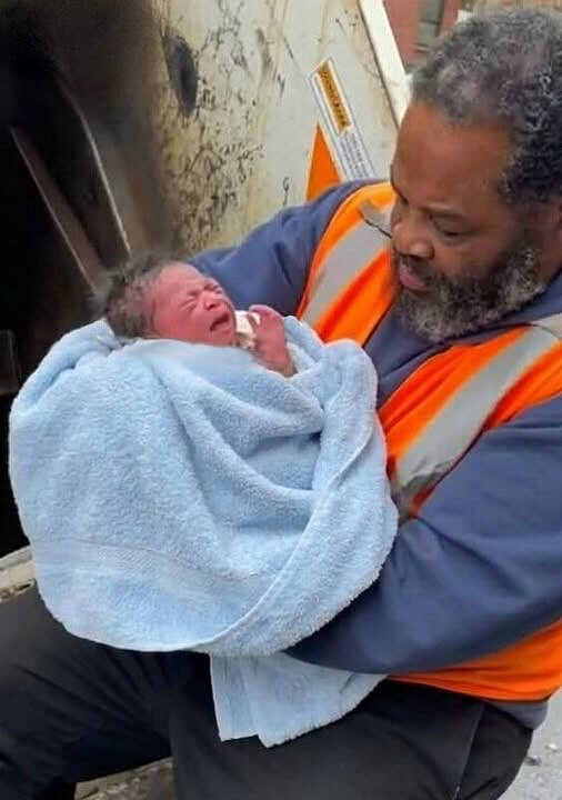 The image showed a man in a reflective jacket, sitting on the edge of a garbage truck, holding a newborn as gently as if the world itself depended on it.